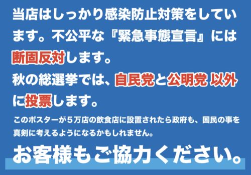 「自公以外に投票」のポスター(5万店の飲食店に設置)には政権の失策のツケを払わされた飲食店の怒りが込められている。これがなかなかインパクト有りなのです。どこか「#KK破談一択」デモを主催されている京さん作成のプラカードに似ています。 「#KK破…