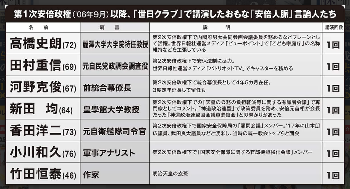 再度、統一教会関連団体の「世日クラブ」で講演した人リストを振り返ろう。